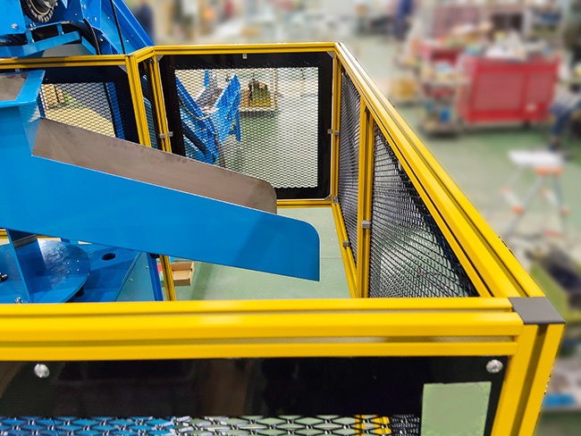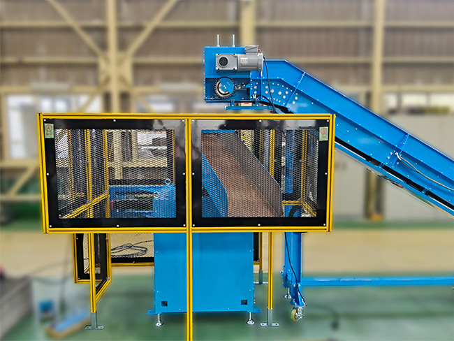 油分が多く硬い搬送物のため、鉄製スラットコンベアを採用。また、鉄箱の段取り替え時も生産を止めずに運用できるよう、振り分けシュートを設置しています。