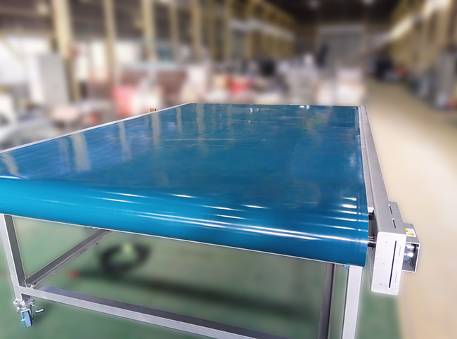 成形機で製造された樹脂成形品を搬送するための幅広樹脂ベルトコンベアを製作しました。